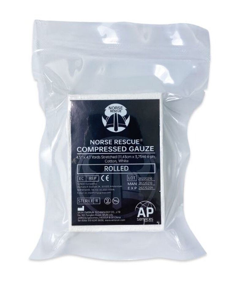 La garza compressa NORSE RESCUE®, arrotolata, è realizzata in cotone di prima qualità per fornire assorbimento e stabilità eccezionali per un'efficace gestione della ferita.