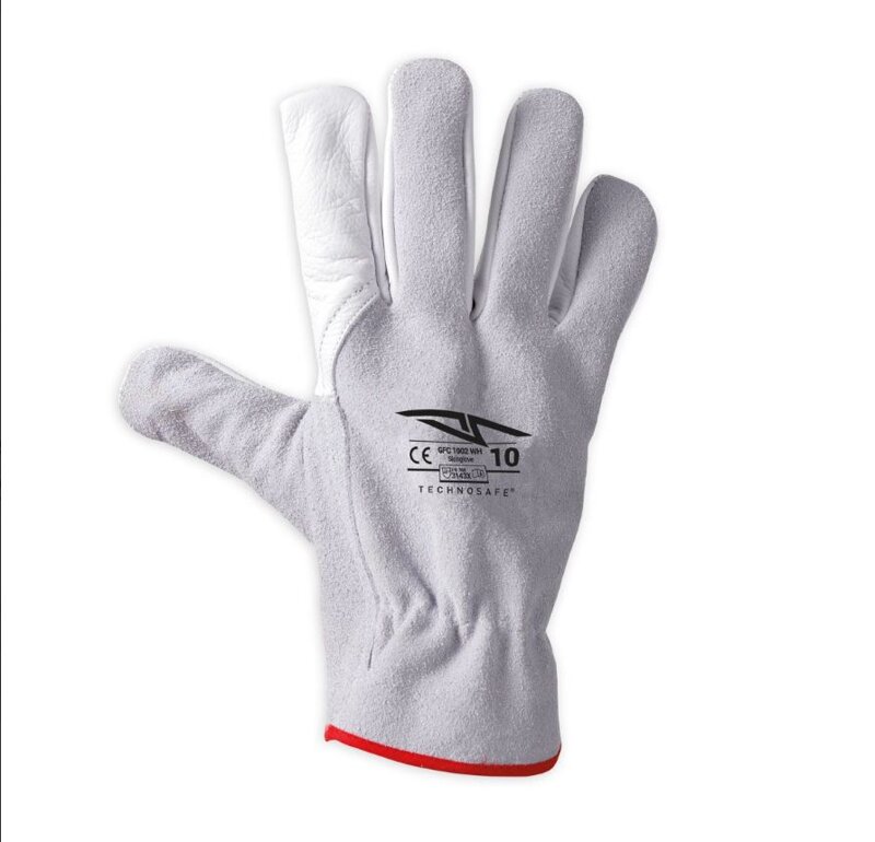 Guanto a 5 dita con forma anatomica (destra/sinistra), modello Driver Combi, doppia cucitura di rinforzo tra indice e pollice, elastico stringipolso applicato internamente sul lato dorso, orlatura con fettuccia di colore diverso a seconda della taglia. Spessore pelle circa 1.6-1.9 mm (doppia parete).