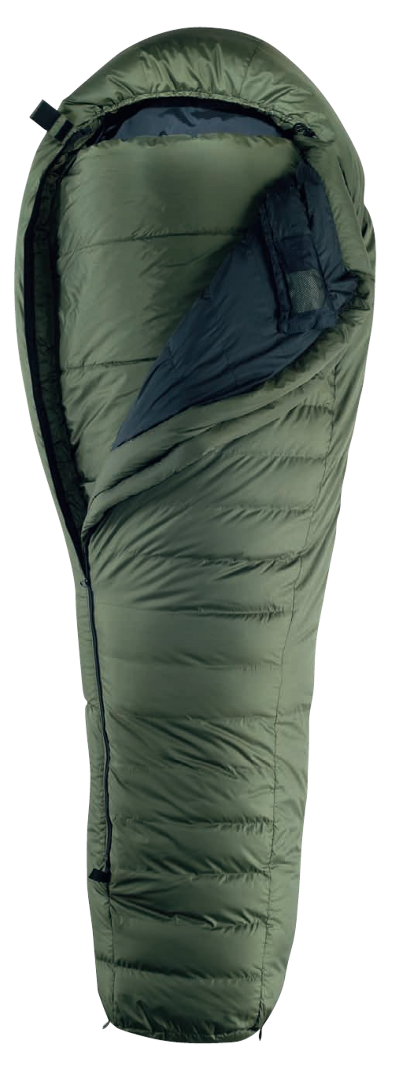 Il set è composto da due distinti sacchi: esterno e interno a forma di mummia con cappuccio, che possono essere usati separatamente oppure inseriti uno dentro l’altro, per aumentare l’isolamento termico. Ogni sacco è fornito di custodia in tessuto di poliammide colore nero con sistema di compressione.